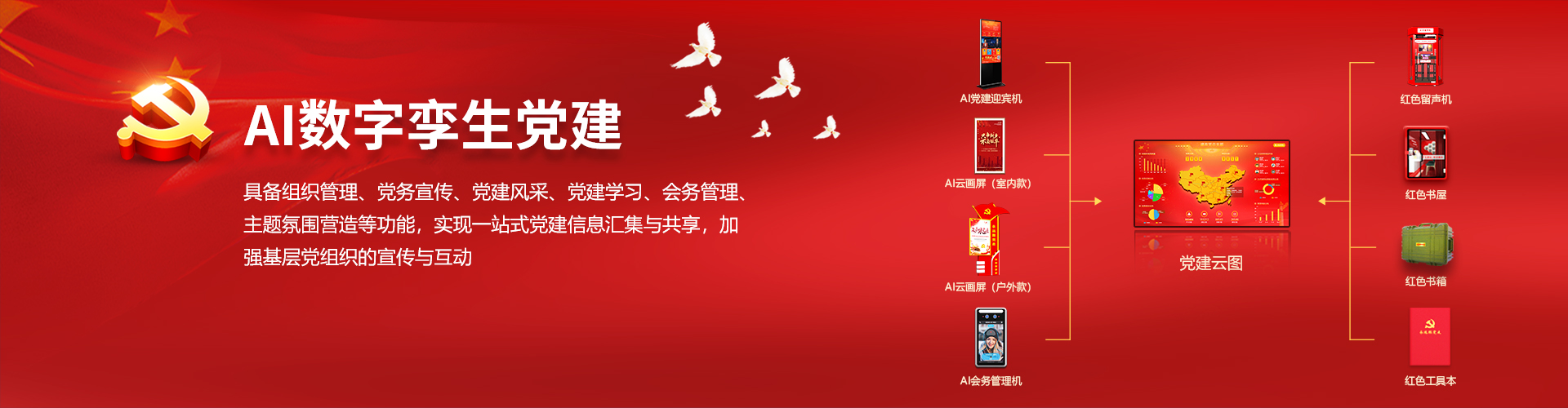 党建风采辅助展示:一键展示AI党建迎宾机内部党建内容;一键更换AI云画屏数字内容。
